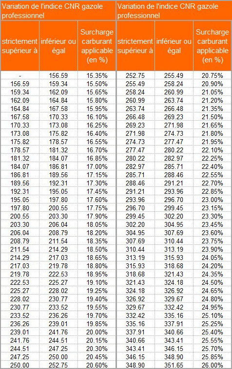 Cette surcharge s'applique à tous les envois nationaux. Son montant est indexé sur la variation de l'indice CNR gazole professionnel.